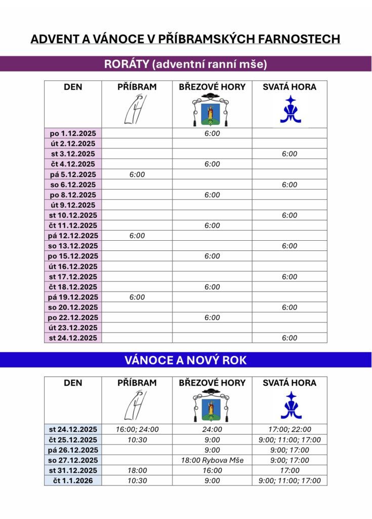 | 24.12. 2025 | 16:00 mše svatá pro rodiny s dětmi 24:00 půlnoční mše svatá | 22:00 | 14:00 |